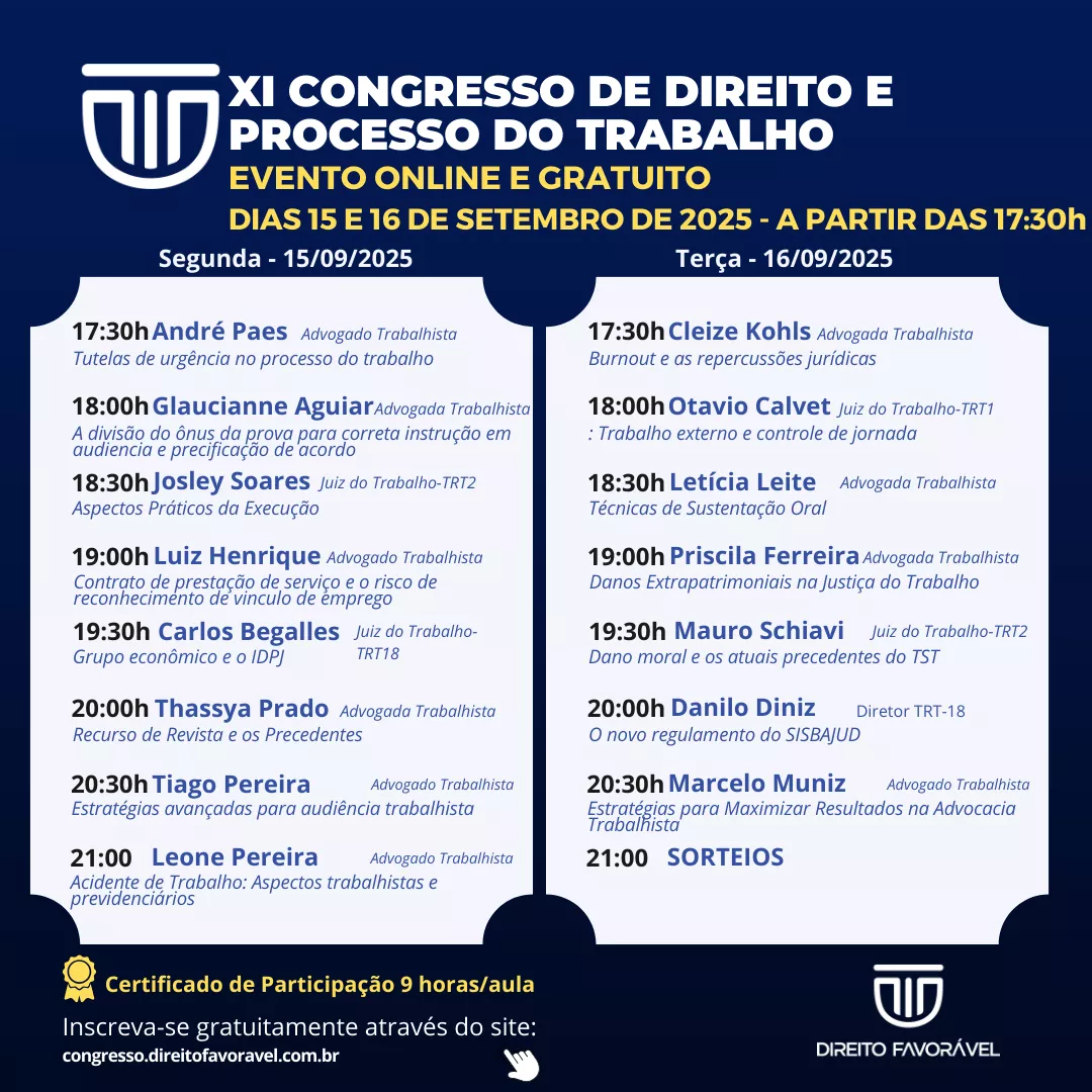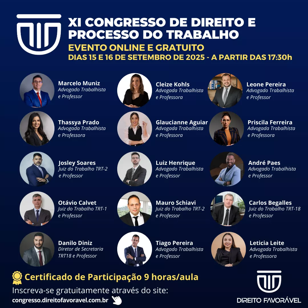 Prepare-se para uma verdadeira imersão no que há de mais atual, estratégico e relevante no Direito Material e Processual do Trabalho. Nesta edição especial, juízes e advogados de renome nacional estarão reunidos para compartilhar experiências, discutir jurisprudências recentes e apresentar soluções práticas para os desafios da advocacia moderna.